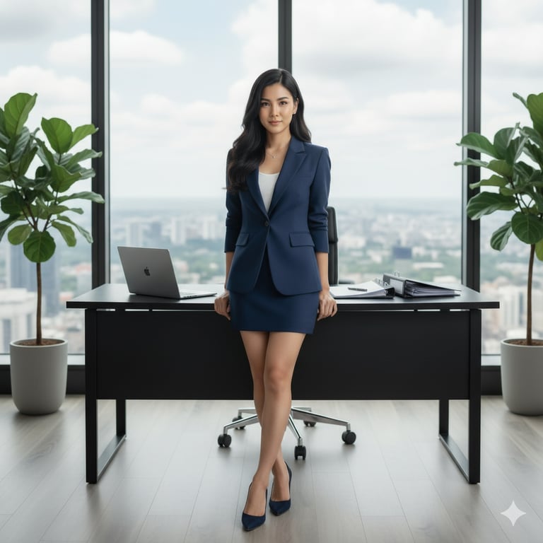 Full shot, professional corporate fashion portrait of a successful Asian businesswoman. Her face and identity should be an exact match to the person in the reference image, including her facial features and age from the reference photo. She stands confidently, leaning back against a sleek, modern black executive desk in a high-rise corner office. Her body is slightly angled in a graceful S-curve pose, with one leg crossed in front of the other. She maintains the original gentle, confident smile and a poised expression, gazing directly into the camera. She has long, straight, dark brown hair parted to the side and flowing naturally over her shoulders. She is wearing a chic, tailored navy blue business suit, consisting of a modern single-breasted blazer and a matching mini-skirt. Underneath the blazer, she wears a simple white scoop-neck top. The outfit is completed with elegant navy blue high-heeled pumps. A delicate silver necklace with a small pendant adorns her neck. Her makeup is natural and polished. The setting is a luxurious, minimalist office with floor-to-ceiling windows offering a panoramic, slightly blurred view of a sprawling cityscape under a bright, partly cloudy daytime sky. Two large potted fiddle leaf fig plants are placed on either side of the scene, adding a touch of nature to the corporate environment. On the desk, there is a laptop, a neat stack of documents, and a file binder. The lighting is soft and flattering, primarily sourced from the large window behind her, creating a subtle rim light on her hair and shoulders. A professional fill light from the front illuminates her perfectly, balancing the exposure against the bright background. The color palette is dominated by cool tones of navy blue, grey, and white, with contrasting warm skin tones and green from the plants. Photographed with a DSLR camera using an 85mm f/1.8 lens. The aperture is set to f/4 to achieve a sharp subject with a beautifully soft-focused background (bokeh). The composition is centered and balanced. The image has a cinematic, clean, and aspirational mood. Ultra-realistic, hyper-detailed, sharp focus, high resolution, 8K, professional retouching."