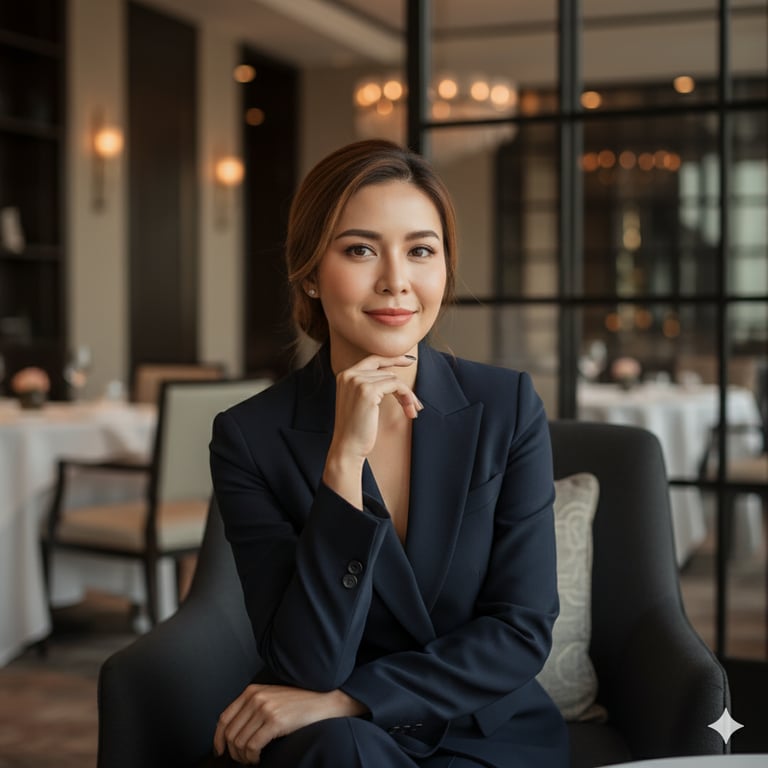 ส่วนที่ 1: ตัวแบบและฉาก (Subject & Setting) An elegant and confident female business executive... luxurious, upscale restaurant or hotel lounge... เราเริ่มต้นด้วยการบอก AI ชัดๆ ว่าอยากได้ "ผู้บริหารหญิง" ที่มีลุค "สง่างามและมั่นใจ" (Elegant and confident) และระบุฉากหลังไปเลยว่าต้องเป็น "ร้านอาหารหรือเลานจ์ที่หรูหรา"