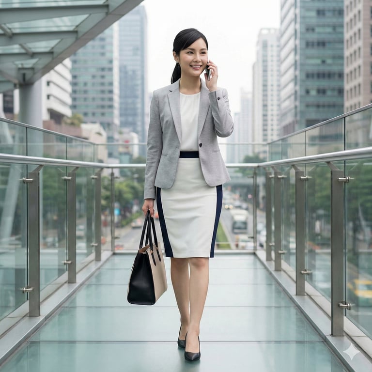 A hyper-realistic full-body shot of [INSERT YOUR REFERENCE FACE HERE], a professional businesswoman walking elegantly along a modern urban pedestrian skywalk. The subject has the exact facial features, skin tone, and identity of the provided reference image, seamlessly integrated onto this body. She preserves the original pose: looking slightly forward and off-camera, holding a white smartphone to her right ear. Her expression is a cheerful, confident smile, radiating optimism. Her hair is styled in a sleek, dark low ponytail with side-swept bangs, consistent with the reference look.