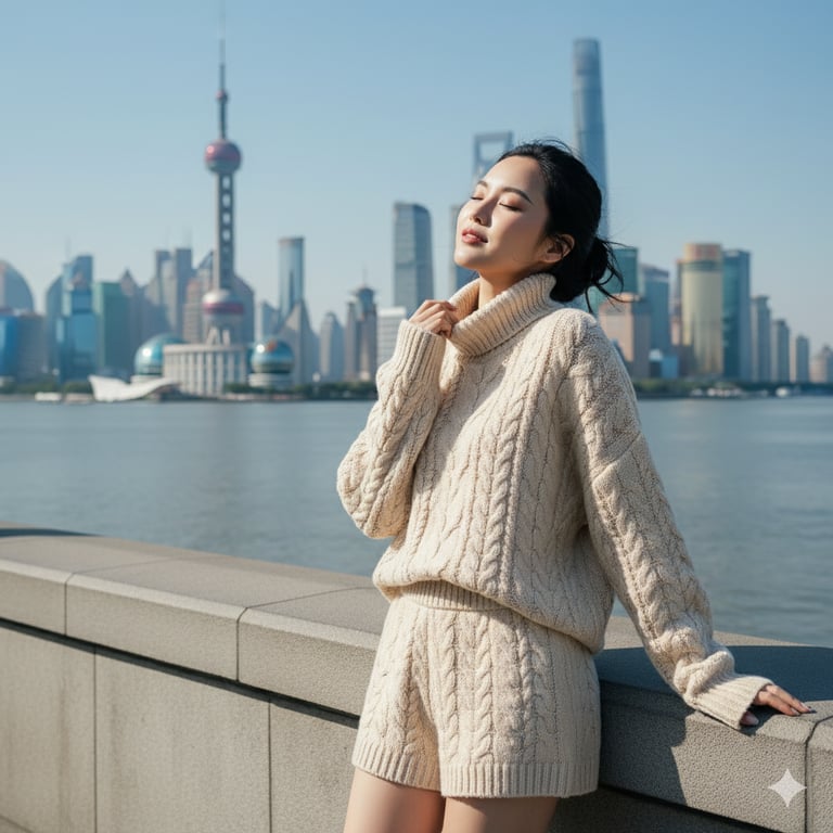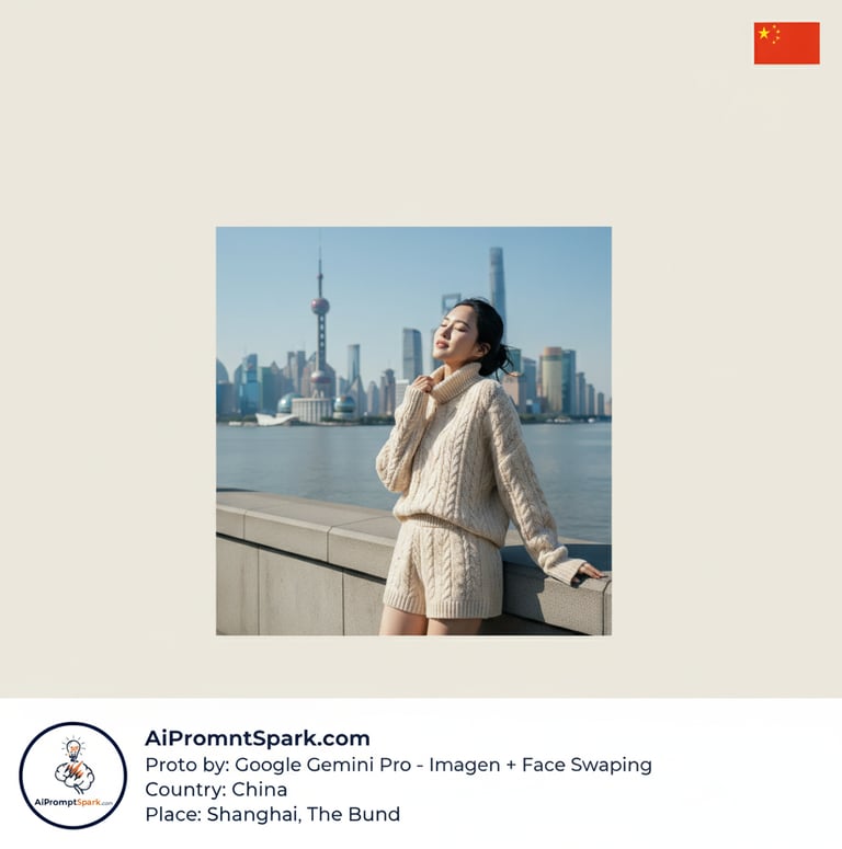 [Ai Prompt] สลับหน้าไปถ่ายแฟชั่นสุดปังที่เซี่ยงไฮ้! โพสท่าชิคๆ ริม The Bund กับชุดไหมพรมสุด Cozy ด้วย AI