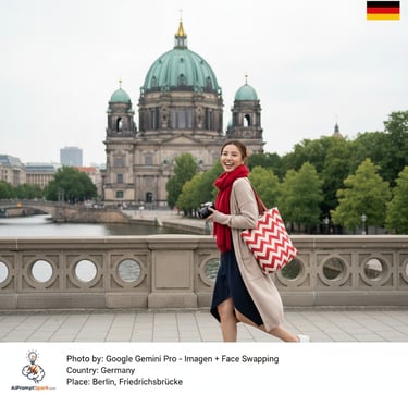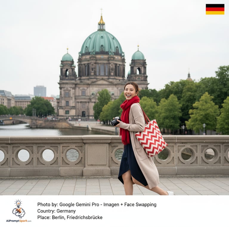 เที่ยวทิพย์เบอร์ลิน! ลอง AI Prompt นี้สร้างรูปคุณเดินเล่นบนสะพาน Friedrichsbrücke หน้ามหาวิหารเบอร์ลิน (Berliner Dom) เรียนรู้วิธี Face Swap ง่ายๆ ด้วย Gemini