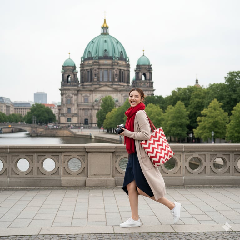 ดูภาพตัวอย่างด้านล่างสิครับ นางแบบของเรากำลังเดินเล่นอย่างมีความสุขบน สะพาน Friedrichsbrücke โดยมีฉากหลังเป็น มหาวิหารเบอร์ลิน (Berliner Dom) สุดอลังการ แถมสไตล์การแต่งตัวก็จัดเต็ม ทั้งผ้าพันคอสีแดงสดที่ดึงดูดสายตา เสื้อคลุมสีเบจ และรองเท้าผ้าใบสีขาว ดูเป็นนักท่องเที่ยวที่ชิคสุดๆ ไปเลย