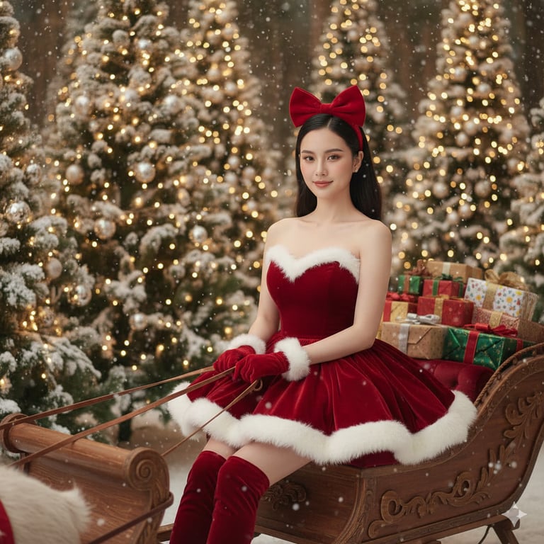 A masterpiece cinematic full-body portrait of the specific woman from the provided reference photo, accurately capturing her unique facial features, eyes shape, and distinct identity, maintaining her exact age and facial structure as seen in the second image. She is posing gracefully on a vintage ornate wooden sleigh pulled by majestic reindeers in a magical winter wonderland. She has long, lustrous straight jet-black hair flowing elegantly over her shoulders, wearing a luxurious and sexy deep red velvet strapless mini dress featuring a sweetheart neckline and thick, plush white faux-fur trim along the top and the hem of her voluminous puffy skirt. She wears a prominent, oversized bright red velvet bow headband on her head, matching red velvet fingerless gloves with white fur cuffs, and seductive red velvet thigh-high boots. Her expression is a soft, confident smile with eyes reflecting the festive spirit, looking directly into the camera, perfectly mirroring the emotion and gaze direction of the reference subject. She is holding thin brown leather reins. The background is a breathtaking snowy pine forest during a gentle snowfall, filled with numerous tall Christmas trees lavishly decorated with shimmering warm golden fairy lights and silver ornaments, creating an intense, creamy golden bokeh effect. A pile of colorful wrapped gift boxes is on the sleigh. The lighting is exquisite, featuring soft natural ambient light mixed with the warm glow from the festive decorations, creating a dreamy, ethereal atmosphere. Ultra-realistic skin textures, 8k resolution, highly detailed fabric textures of velvet and fur, professional color grading, hyper-realistic, sharp focus on the specific facial details of the reference person to ensure perfect likeness and seamless face integration.