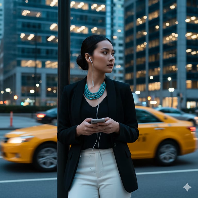 "A stunning, hyper-realistic cinematic street photography portrait of a woman in her late 20s. The prompt uses the face and identity of the person from the second reference image. The subject has dark skin and black hair elegantly styled in a sleek bun. Her expression is serious and thoughtful as she gazes away from the camera, looking towards the right side of the frame. She is standing casually, leaning against a dark pole, holding a silver smartphone with wired headphones connected. The woman is wearing a stylish, long black blazer or coat layered over a black v-neck top and crisp white or off-white pants. A striking detail is her large turquoise-colored multi-layered necklace that adds a pop of color to her outfit. The background is a bustling metropolitan business district at dusk. Modern, dark, glass office buildings with warm, glowing lights visible from inside their windows create a captivating backdrop. A yellow taxi speeds by in the background, creating a dynamic, eye-catching motion blur effect that adds a sense of urban energy. The lighting is soft and natural, with multiple light sources from the city creating subtle, diffused shadows that highlight her facial features and clothing details. The camera angle is an eye-level medium shot, capturing her from the waist up. The image has a shallow depth of field, with the focus sharply on the subject and a beautiful, gentle bokeh in the background. The overall color palette is a cool tone, dominated by deep blues and blacks, contrasted with warm yellow and orange tones from the city lights and the taxi. The photography style is reminiscent of famous cinematic stills, with a strong sense of mood and story. Detailed skin texture, realistic imperfections, and a natural, un-retouched aesthetic. Shot on a high-end digital camera with a wide aperture lens (e.g., Canon 5D Mark IV, f/1.8). Highly detailed, masterpiece quality, 4K resolution."