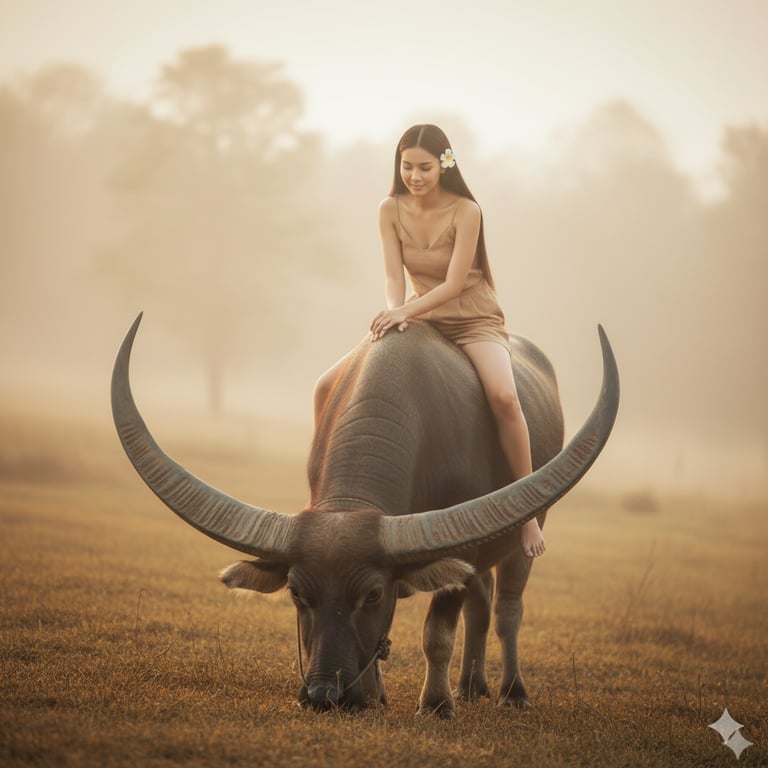 "Ethereal and dreamy, fine-art portrait photography capturing a serene, almost magical moment of harmony between a beautiful young woman and a magnificent water buffalo. The image evokes a timeless, idyllic vision of rural life in Southeast Asia. Subject Details: The woman's face and identity should be an exact match to the person in the reference image. She has a gentle, sweet, and contented smile on her face. Her gaze is directed softly downwards, looking affectionately towards the buffalo's head. Her hair is very long, healthy, and straight, with a dark, raven-black color that flows down her back. A single, delicate white plumeria flower is gracefully tucked behind her right ear, adding a touch of natural elegance. Clothing: She is dressed in simple, traditional rural attire made from natural-looking fabric. The outfit consists of a sleeveless, light-brown or beige camisole-style top and matching loose-fitting shorts or trousers. The clothing is humble and practical, fitting the rustic theme. She is barefoot, enhancing her connection to the earth and the natural setting. Pose & Animal Interaction: The woman is seated with effortless grace and confidence atop a very large water buffalo. She sits sideways on its broad back, with both hands resting gently on its hide, indicating a familiar and trusting bond between them. Her posture is relaxed and poised. The water buffalo itself is a majestic creature, with exceptionally long, grand, curved horns that sweep outwards in a dramatic arc. The buffalo is depicted in a state of peace, with its head lowered as it grazes on the grass. Lighting & Atmosphere: The scene is bathed in the warm, golden light of the golden hour (early morning or late afternoon). The light quality is incredibly soft, glowing, and diffused, creating a dreamlike ambiance. This effect is significantly enhanced by a pervasive mist or fog that blankets the landscape. This atmospheric haze catches the light, causing it to bloom softly and creating a beautiful, ethereal glow around the subjects, subtly separating them from the background with a soft rim light. Composition: This is a medium-wide shot, composed to capture the relationship between the woman and the entire upper body of the buffalo, including its impressive horns. They are positioned as the central focus of the image. The buffalo's massive horns act as powerful natural frames, guiding the viewer's eye across the scene. The sloping ground on which they are situated adds a gentle diagonal line, creating a sense of depth and dynamism. Background & Setting: The setting is a tranquil, rural countryside landscape. They are on a grassy hillside covered in dry, golden-brown grass. The background melts away into the soft mist, with only the faint, impressionistic shapes of distant trees or foliage visible. This intentionally obscured background ensures that the focus remains entirely on the touching scene in the foreground. Camera & Technique: The photograph was taken with a professional camera and likely a telephoto or portrait lens to compress the background and enhance the focus on the subjects. The photographer used a wide aperture to create a shallow depth of field, further softening the misty background. A key technique used here is achieving a soft-focus look across the entire image, which contributes heavily to the dreamy, painterly quality. This might be achieved in-camera or through post-processing techniques like the Orton Effect. Color Palette & Post-Processing: The color palette is warm, harmonious, and muted, dominated by earthy tones. This includes the golden-browns of the grass and her clothing, the deep grey-black of the buffalo's hide, and the soft, warm tones of her skin. The overall image has been professionally color-graded to enhance this warm, golden, nostalgic feel. Post-processing is significant, focusing on creating the soft, glowing effect, smoothing skin to perfection, and enhancing the atmospheric mist to achieve the final, ethereal masterpiece."
