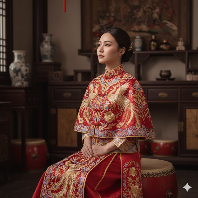 She is wearing an opulent and exquisitely detailed traditional Chinese wedding gown, a Qun Kua...: ระบุชื่อชุดไปเลยว่า "คุนควา" (Qun Kua) พร้อมบรรยายความอลังการงานสร้าง ทั้งเนื้อผ้าที่เป็นผ้าไหมโบรเคดสีแดงสด, การปักดิ้นทองดิ้นเงินเป็นลวดลายนกฟีนิกซ์และดอกไม้สุดวิจิตร, มีเสื้อคลุมไหล่, คอจีน และแขนยาว บอกเลยว่า AI ได้ยินแบบนี้ จัดเต็มให้แน่นอน