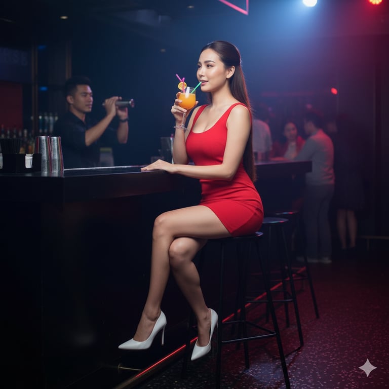 "A captivating full-shot portrait of a beautiful Asian woman in her late 20s with the face and identity of the woman in the second uploaded image. She has long, straight, dark brown hair flowing over her shoulders. She sits elegantly on a tall, black bar stool at a glossy black bar counter, her body angled slightly toward the camera. Her right leg is crossed over her left, showcasing her toned legs, and she wears a chic, form-fitting, sleeveless red mini dress with a scoop neckline that accentuates her figure. The dress is made of a smooth, stretch fabric, and its vibrant red color pops against the darker background. On her feet, she wears a pair of sleek white high heels with pointed toes. She holds an orange cocktail in a stem glass with a straw and a garnish, raising it to her lips as if about to take a sip. Her expression is a relaxed, gentle smile, and she looks away from the camera, gazing towards the side with a seductive and alluring air. Her posture is confident and graceful, exuding an aura of sophistication and subtle sensuality. The scene is set inside a dimly lit, high-end bar or nightclub. In the background, a male bartender, slightly out of focus, is busy shaking a cocktail shaker behind the bar, with other patrons visible as blurred figures in the distance. The background is a mix of deep blues, purples, and reds from the ambient lighting, with spotlights casting a dramatic glow on the main subject. The floor is dark and scattered with small, reflective confetti-like dots, adding a touch of festive mood. The photograph is a professional, high-resolution shot with a cinematic and dramatic style. The lighting is a mix of soft studio light on the subject's face and hard spotlights from above, creating strong highlights and deep shadows that add depth and drama. The focus is sharp on the woman, with a beautiful, soft bokeh effect blurring the background, drawing all attention to her. The colors are rich and saturated, with a warm and inviting tone. The image is expertly retouched to enhance skin clarity and smooth textures, giving it a polished, high-fashion magazine quality. Masterpiece, best quality, cinematic, ultra-realistic, highly detailed."