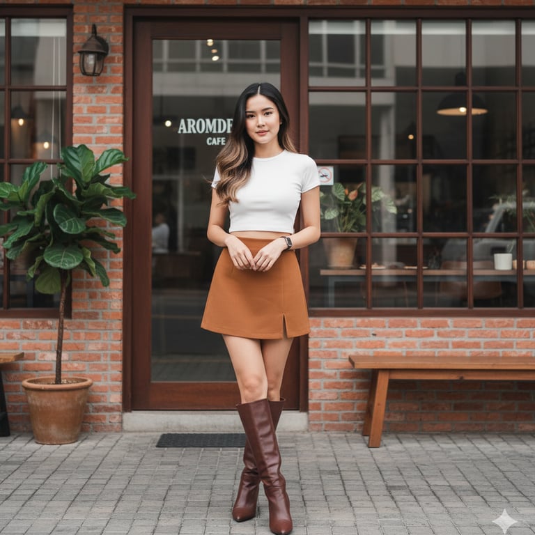 "Masterpiece, best quality, ultra-realistic, photorealistic, 8K UHD, professional photography, RAW photo, A full-body fashion street style portrait of a woman, exuding confidence and chic elegance. She stands gracefully centered in front of a modern, stylish coffee shop named "AROMDEE CAFE". Subject Details: Face and Expression: The subject's entire facial identity, features, bone structure, and likeness must be an exact and precise replication of the person in the provided reference photo. Her age should perfectly match the age of the person in the reference image. She maintains a gentle, warm, and confident smile, with her lips slightly parted. Her eyes are bright and engaging, looking directly into the camera lens. Her head is tilted ever so slightly to her right, perfectly mirroring the pose from the original concept. The skin texture should be natural and match the reference. Hair: Her hair is long, luscious, and voluminous, cascading down past her shoulders in soft, elegant waves. It is styled with a clean center part. The hair color is a sophisticated light brown balayage, with beautifully blended honey and caramel highlights that catch the light perfectly, giving it immense depth and dimension. Pose and Body: She stands in a poised and relaxed full-length pose. Her body is oriented towards the camera, with one leg slightly forward to create a dynamic and flattering line. Her hands are clasped loosely and elegantly in front of her waist. Her posture is impeccable, radiating self-assurance and grace. The overall mood of her pose is effortlessly stylish and approachable. Outfit and Styling: Top: She is wearing a pristine white, form-fitting, short-sleeve crop top with a classic crew neckline. The fabric appears to be a high-quality, soft cotton jersey that hugs her figure perfectly. Skirt: She is styled in a high-waisted, A-line mini skirt in a rich, earthy caramel brown color. The skirt is impeccably tailored and features a small, subtle, yet alluring slit on the left thigh, adding a hint of sexy sophistication. Footwear: Completing the ensemble, she wears a pair of stunning knee-high leather boots in a deep, complementary shade of brown. The boots have a sleek, pointed-toe design and a modern, sturdy block heel, enhancing the chic and fashionable aesthetic. Accessories: A single, elegant, and minimalistic watch with a dark strap is visible on her left wrist, adding a touch of refined detail. Environment and Background: Location: The setting is the entrance of a trendy, urban café. The background features a striking red brick wall that provides a warm, textured backdrop. Architectural Elements: A large glass door with a dark wooden frame stands behind her. Expansive glass windows with matching dark frames reveal a glimpse of the café's interior. To the right of the subject, a simple wooden bench rests against the brick wall. Foreground and Ground: The ground beneath her is a clean, gray cobblestone or paver sidewalk, providing a neutral base for the composition. Decorative Elements: The entrance is adorned with several healthy, vibrant green potted plants in rustic terracotta pots, including a prominent Fiddle Leaf Fig, which adds a touch of nature and life to the urban scene. Photography and Technical Details: Camera and Lens: Shot with a high-end DSLR camera, likely a Canon EOS 5D Mark IV, paired with a professional-grade prime portrait lens such as an 85mm f/1.4L lens to achieve sharp subject focus and beautiful background compression. Lighting: The scene is illuminated by bright, soft, diffused natural daylight, characteristic of an overcast day or open shade. The primary light source is positioned frontally, casting soft, flattering light on the subject and minimizing harsh shadows, beautifully sculpting her features and outfit. Composition: An eye-level shot with a full-body framing. The composition is strong and symmetrical, with the subject perfectly centered and framed by the vertical lines of the café's door and windows. Focus and Aperture: The aperture is set around f/2.8, creating a tack-sharp focus on the woman while rendering the immediate background with pleasing clarity and the more distant elements with a subtle, creamy bokeh. Color Grading and Post-Processing: The image is professionally color-graded with a warm color palette. The colors are rich and saturated, with an emphasis on the earthy tones of brown, red, and terracotta, contrasted by the crisp white of her top and the vibrant green of the plants. The skin tones are rendered accurately and beautifully. The image has been meticulously retouched to achieve a polished, high-fashion magazine look while maintaining a sense of realism and authenticity"