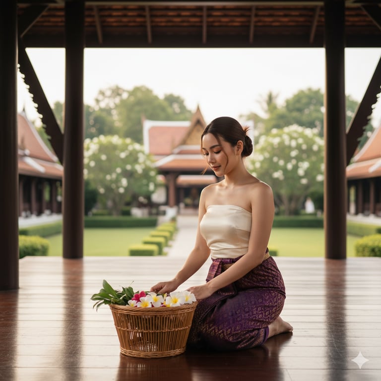 "A cinematic full shot portrait of a serene young Thai woman in her early 20s, with a gentle, relaxed expression, looking down at a traditional woven basket in front of her. She is gracefully kneeling on a polished wooden floor within a classic Thai house pavilion, dressed in a traditional yet modern Thai costume. Her outfit features a simple, elegant cream-colored strapless top and a deep purple silk sarong with intricate gold patterns, highlighting her graceful posture. Her hair is neatly styled in a simple, high bun. (Face Swapping with the second reference image to adopt her distinct facial features, and keep her original age and face type) The setting is a beautiful, traditional Thai-style wooden house with large pillars, leading to an open-air courtyard. The background is softly blurred with a beautiful bokeh effect, featuring lush green trees and traditional Thai architecture, bathed in the soft, warm glow of the golden hour. The lighting is natural and gentle, with a soft backlight that creates a subtle rim light around her silhouette and hair, emphasizing the delicate details. The mood is calm, timeless, and culturally rich. The colors are warm and inviting, dominated by the rich browns of the wood, the soft creams and purples of her attire, and the vibrant greens of the foliage. The overall atmosphere is one of peaceful tradition and quiet elegance, captured with a high-resolution, sharp focus on the subject. Cinematic, Photorealistic, High Detail, Sharp Focus, Golden Hour, Traditional Thai Architecture, Wooden Floor, Natural Light."