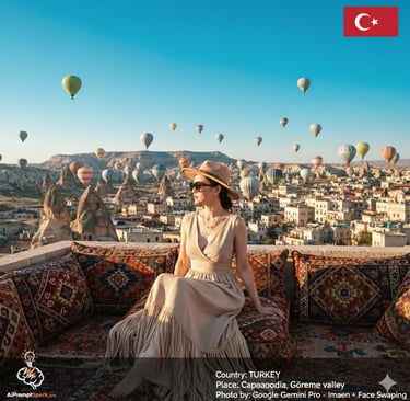 สวัสดีครับ! หนุ่มๆ สาวๆ ชาว AiPromptSpark ครับ ใครบ้างไม่เคยฝันอยากไปเยือน "คัปปาโดเกีย" (Cappadocia) ที่ตุรกี ดินแดนแห่งเทพนิยายที่มีบอลลูนลมร้อนลอยเต็มฟ้า? โดยเฉพาะช็อตเด็ดที่ต้องมี คือรูปเรานั่งสวยๆ (หรือหล่อๆ) บนดาดฟ้าโรงแรมที่ปูพรมสไตล์ตุรกี อวดวิวหลักล้าน... แต่เดี๋ยวก่อน! ค่าตั๋ว ค่าโรงแรมไม่ใช่เล่นๆ นะครับ วันนี้ผมมีวิธีเที่ยวทิพย์แบบเนียนกริบ แถมใช้ใบหน้าของเราเอง! เราจะมาใช้ AI Prompt สร้างภาพสุดปังนี้กันด้วย Google Gemini และ Imagen กันครับ ภาพที่ได้ออกมาบอกเลยว่า "โคตรเนียน" เหมือนบินไปถ่ายเองจริงๆ พร้อมแล้วไปดูกันเลย!