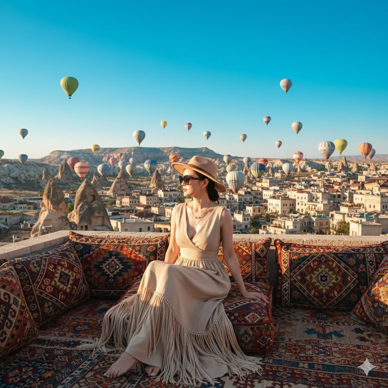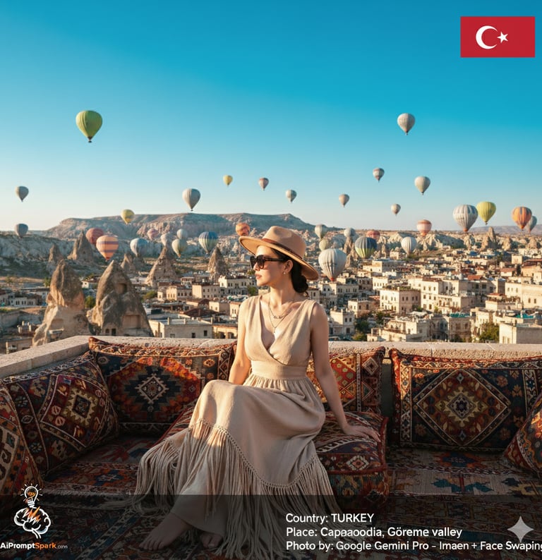 (Instruction: This prompt must be used with a reference image for the subject's face. The generated image must perfectly capture the facial likeness, identity, and apparent age of the person from the reference photo, seamlessly integrating them into the described scene.) A photorealistic, ultra-detailed, high-resolution masterpiece photograph in a professional travel lifestyle and fashion portrait style. The image captures a serene and poignant moment in Cappadocia, Turkey. The central subject is a woman whose face, identity, and skin tone must precisely match the person in the provided reference image. She is sitting with perfect poise on a traditional Turkish rooftop terrace. Her pose is relaxed yet sophisticated; she sits on her shins or with legs tucked beneath her on a large, intricately patterned cushion. Her body is angled gently towards the camera, but her head is turned away in the exact same graceful three-quarters profile as the original photo, looking out towards the viewer's left. Her expression is one of quiet contemplation and serenity. She wears a pair of large, fashionable, dark sunglasses that hide her eyes. Perched perfectly on her head is a chic, light-beige or tan fedora-style hat. Her hair, matching the color and texture of the reference subject, is tucked neatly under the hat. She is dressed in a beautiful, sleeveless, bohemian-style maxi dress in a matching light beige or tan color. The dress features a deep V-neckline and a flowing skirt that ends in a dramatic, thick, long fringe, which cascades down around her bare feet (which are not visible, tucked under her) and onto the cushions below. The fabric appears to be a natural, woven material like linen or soft cotton. Her accessories are subtle but elegant: a delicate, layered gold necklace adorns her neck. The setting is a quintessential Cappadocian rooftop, furnished for relaxation. The entire space is covered with vibrant, patterned Turkish kilim rugs and a collection of large, plush cushions. These cushions and rugs feature traditional geometric and floral patterns in warm, earthy tones of red, brown, orange, and blue. The backdrop is the star of the show: a stunning, panoramic, wide-angle view of the Göreme valley. The sky is a vast expanse of clear, brilliant, cloudless cyan-blue. This sky is magically populated by a multitude of colorful hot air balloons, drifting lazily across the horizon. There are dozens of balloons, some large and close, others small and distant, creating a spectacular sense of depth. The balloons are a riot of color: bright red, sunny yellow, vibrant green, deep blue, orange, and many with multi-colored striped patterns. Below the balloons, the unique topography of Cappadocia unfolds, with its iconic "fairy chimneys," ancient cave dwellings, and stone houses carved into the soft volcanic rock formations. The entire town is bathed in the warm, golden light of early morning. The lighting is bright, natural sunlight, streaming in from the right side of the frame (subject's right). This directional light creates soft, defined shadows, notably from her sunglasses onto her cheek, and beautifully highlights the texture of her dress, the fringe, and the woven rugs. The photographic style is high-dynamic-range (HDR), perfectly balancing the bright, vivid sky with the detailed, shadowy areas of the town and the subject. The composition is a medium-full shot, meticulously framed to include the subject from head to toe (with feet tucked) in the foreground, using her as an anchor to the magnificent, sprawling background. The camera is positioned at eye level with the subject. The technique employs a shallow depth of field, likely shot with a prime portrait lens (e.g., 50mm or 85mm) at an aperture around f/2.8-f/4. This renders the woman and her immediate surroundings in sharp, crisp focus, while the town and the balloons in the background are softened into a beautiful, creamy bokeh, drawing the viewer's eye to the subject while still celebrating the iconic location. The color palette is a harmonious blend of warm earth tones (beige, tan, brown, red) from the subject, cushions, and landscape, contrasted brilliantly with the cool, vibrant blue of the sky and the bright, saturated pops of color from the balloons. The image is professionally retouched, with enhanced saturation, sharp details, and a clean, polished, high-end travel magazine aesthetic.