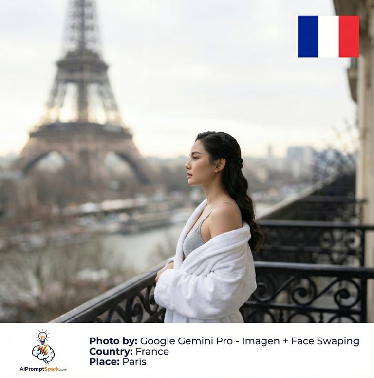 Masterpiece, Photorealistic, 8k UHD, Highly Detailed Portrait. Subject & Face Instruction: A stunning woman [INSERT REFERENCE FACE HERE: Ensure the generated face matches the facial structure, age, and identity of the provided reference image while maintaining the original subject's expression and angle]. She is captured in a candid, medium shot profile view, looking to the left side of the frame. Her expression is calm, contemplative, and serene, gazing thoughtfully into the distance. Her hair is styled in a dark, pulled-back look with a braided detail acting as a headband. Attire & Texture: She is dressed in luxurious, casual morning loungewear. She wears a soft, heather-grey cotton bralette with a white elastic band, highlighting a natural shape. Over this, she wears a plush, white terry-cloth bathrobe, draped loosely off her shoulders to reveal her upper arms and shoulders, creating a soft, sexy mood. The fabric textures—soft cotton and fluffy towel material—are highly detailed. Background & Setting: Standing on a balcony with the iconic Eiffel Tower in the background, rendered with a soft bokeh blur. The setting is Paris, with blurred Haussmann-style architecture visible below. The sky is overcast, providing soft, even lighting. Lighting & Technical: Natural, diffused morning light. Soft shadows, flattering skin illumination. Shot on an 85mm lens at f/2.8 for depth of field. The focus is sharp on the subject, with a creamy, blurred background. Cinematic color grading with neutral and cool tones.