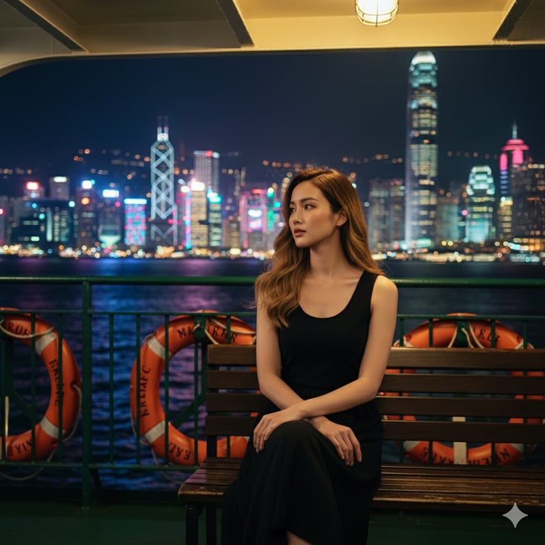 A masterpiece, ultra-realistic, 8K UHD cinematic night portrait, capturing a moment of serene contemplation. The subject is a woman whose facial identity, features, and likeness are an exact match to the person in the provided reference image [INS-FACE-ID]. The AI must replicate this specific person's face and ethnicity, with an age that matches the reference image. She possesses long, flowing, wavy hair, the color of rich honey-blonde with subtle highlights, parted slightly off-center and cascading gently over her shoulders. Crucially, her facial expression must be neutral, calm, and deeply pensive, her eyes holding a distant, soft gaze, directed off-camera towards the left side of the frame, avoiding direct eye contact with the viewer. Her head is turned slightly to her right (camera left), adding to the candid, contemplative feel. She is positioned sitting on a rustic, dark wooden bench, part of a boat's exterior seating. Her pose is poised and graceful; she sits upright but relaxed, her body angled slightly towards the camera. Her left arm rests softly on her lap, with her right hand gently placed on top of her left. The mood of her posture is one of quiet elegance and effortless sophistication. She is dressed in a minimalist yet chic sleeveless black tank top dress. The dress features a modest scoop neckline and appears to be made of a smooth, soft cotton-blend or knit fabric that subtly follows her form. The dress is simple, classic, and unadorned, drawing focus to the woman herself. No jewelry or accessories are visible, emphasizing a clean, natural aesthetic. The lighting is complex, expertly crafted using a mix of artificial and ambient sources to create depth and mood. A primary, soft key light (likely a diffused off-camera strobe or LED panel) is positioned to the camera's right, casting a flattering, gentle illumination across the right side of her face, her right shoulder, and her arm. This creates a soft falloff into shadow on the left side of her body, sculpting her features beautifully (a subtle Rembrandt lighting pattern). A secondary warm, golden-yellow rim light originates from a ceiling fixture on the boat, located above and slightly behind her, delicately tracing the outline of her hair and her right shoulder, effectively separating her from the dark backdrop. The background itself provides a vibrant, cool-toned fill light, with the city's neon glow casting subtle blue and magenta reflections. The composition is a perfectly balanced medium shot, framing the woman from her upper thighs to the top of her head. She is deliberately placed on the right third of the image, following the rule of thirds, leaving negative space or 'look room' to the left, which her gaze naturally fills. The camera perspective is straight-on, at eye-level with the subject. The foreground and midground are defined by the boat's structure: a distinctive dark green metal railing runs horizontally across the frame, and hanging from it are three bold, bright-orange circular lifebuoys (life preservers), which add a powerful pop of complementary color and visual interest. These railing elements are slightly out of focus, guiding the viewer's eye to the sharp subject. The setting is unmistakably the deck of a ferry, capturing the iconic Hong Kong Star Ferry experience at night. The background is a breathtaking, panoramic view of the Hong Kong city skyline, glittering with millions of lights. Iconic skyscrapers, including the geometric lattice of the Bank of China Tower, are clearly identifiable. The entire city skyline is rendered in a glorious, soft, creamy bokeh, with the points of light blurred into large, beautiful circles of blue, white, and magenta. Below the skyline, the dark, deep blue water of Victoria Harbour ripples, catching and reflecting the neon shimmer. The overall style is a high-fashion editorial or sophisticated environmental portrait, with a strong cinematic quality. The mood is calm, serene, and sophisticated. The color palette is a dynamic, contrasting blend: the cool, deep blues and purples of the night sky and water are set against the warm yellows and oranges of the boat's internal lights and the lifebuoys. The woman's black dress acts as a neutral anchor, while her warm skin tones are rendered beautifully and accurately. The image is technically superb, captured as if using a professional full-frame DSLR camera with a high-end prime portrait lens (e.g., an 85mm f/1.4) shot at a very wide aperture (around f/1.8) to achieve the extremely shallow depth of field and pronounced bokeh. The focus is tack-sharp on the woman's eyes and face. The post-processing is polished and professional, with expert color grading to enhance the contrast between warm and cool tones, perfect exposure balancing, and subtle, natural skin retouching. The final image is pristine, noise-free, and hyper-realistic. Photorealistic, intricate details, sharp focus, magazine quality.