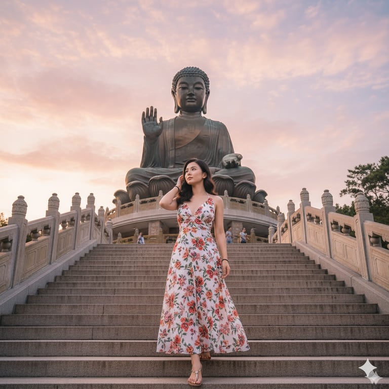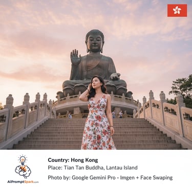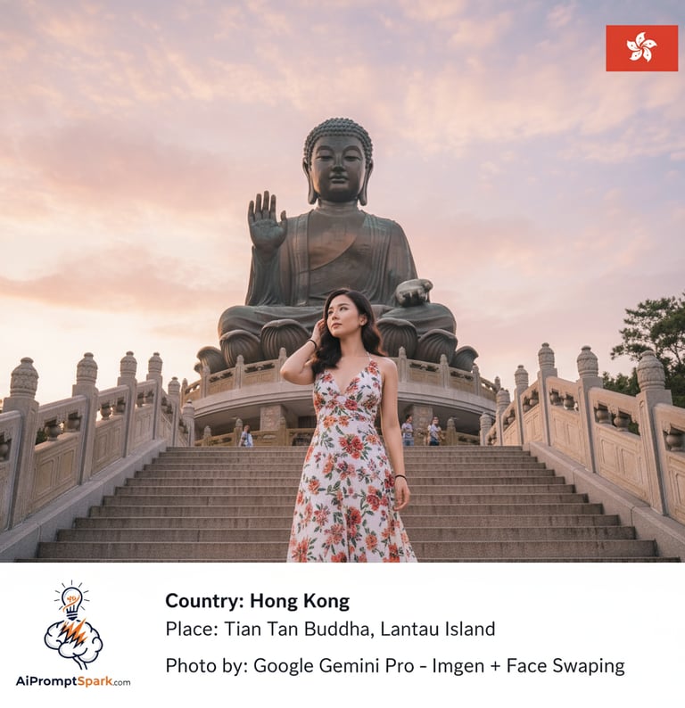 AI Prompt เที่ยวทิพย์: สร้างรูปตัวเองยืนสวยๆ หน้าพระใหญ่เทียนถาน ฮ่องกง ด้วยใบหน้าเราเอง!