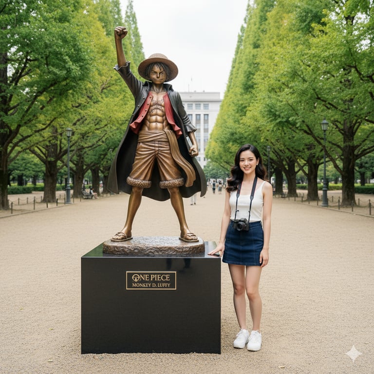 (A hyper-detailed, photorealistic, full-body eye-level medium-wide shot capturing a woman, whose face, age, and identity are derived from the reference image, standing next to a life-sized bronze statue of the anime character Monkey D. Luffy. The scene is set in a beautiful, verdant public park promenade, likely in Japan. The Woman (Subject 1): She stands on the right side of the frame, positioned casually beside the statue. Her body is oriented forward. She is looking directly at the camera with a bright, happy, and gentle smile, matching the positive emotion of the original scene. Her posture is relaxed and at ease, with her arms hanging naturally; her left arm is slightly bent at the side. Her hair, taken from the reference image, is worn naturally, parted slightly off-center. Her attire is casual and comfortable for a day out. She wears a white tank top spaghetti strap, and possibly some faint white text below it. She is wearing dark navy blue mini skirt. On her feet, she sports a pair of clean, white athletic sneakers (trainers). Hanging around her neck by a black strap is a mirrorless or small DSLR camera, resting on her chest. The Statue (Subject 2): To her left, dominating the center-left of the composition, is the bronze statue of Monkey D. Luffy. The statue is dynamically posed, capturing Luffy in his signature post-timeskip outfit: his straw hat, a long captain's coat draped open over his shoulders, his unbuttoned shirt revealing his X-shaped chest scar and defined abdominal muscles, patterned shorts with a furry trim, and his classic sandals. His right arm is thrust triumphantly into the air, clenched in a fist, while his left arm is bent at his side. The bronze material has a rich, metallic patina, with subtle highlights reflecting the diffused daylight. The statue stands on a multi-tiered plinth; the top portion is a metallic gold/brass color, and the main base is a solid, reflective black stone. Engraved in elegant, gold serif lettering on the black plinth are the words 'ONE PIECE' and 'MONKEY D. LUFFY'. Background and Environment: The subjects are standing on a wide pathway made of fine, light-brown gravel. This path is framed on both sides by two rows of tall, majestic trees (resembling Ginkgo trees) with dense, vibrant, light-green foliage. These trees form a natural, leafy canopy and an 'allée' (avenue) effect, drawing the eye into the distance. In the far background, set back a significant distance and visible between the trees, is a large, modern institutional building (like a prefectural office or university). Its clean-line architecture is subtly present. Other indistinct figures of people can be seen walking in the far distance, adding a sense of scale and life to the public space. Classic-style lampposts are also visible along the tree line. Lighting and Atmosphere: The lighting is soft, diffused natural daylight, suggesting either an overcast day or the subjects being in the deep shade of the tree canopy. This even lighting eliminates harsh shadows, providing a clear and pleasant illumination on the woman's face (from the reference image) and the intricate details of the statue. The overall mood is bright, cheerful, pleasant, and casual, capturing a perfect fan or tourist moment. Camera and Composition: The composition is a full shot, captured from a straight-on, eye-level angle. The framing is balanced, capturing the woman from head-to-toe and the statue from its base to the top of its raised fist. The depth of field is moderate (simulating an aperture of f/4 to f/8); the woman and the statue are in sharp focus, while the trees in the mid-ground and the building in the far background are softly blurred (mild bokeh), providing separation without completely obscuring the environment. Technical Parameters: Photorealistic, ultra-detailed, 8K resolution, sharp focus. Shot on a full-frame mirrorless camera, 35mm f/5.6 lens, ISO 200, shutter speed 1/250s. Natural color grading, cool-to-neutral white balance. The colors are true-to-life: vibrant greens from the foliage, natural skin tones (from the reference), deep black and metallic bronze of the statue, and the light blue of the denim. The final image must be clean, with no digital artifacts, perfectly capturing the realistic textures of cotton, denim, skin, metal, gravel, and leaves.)