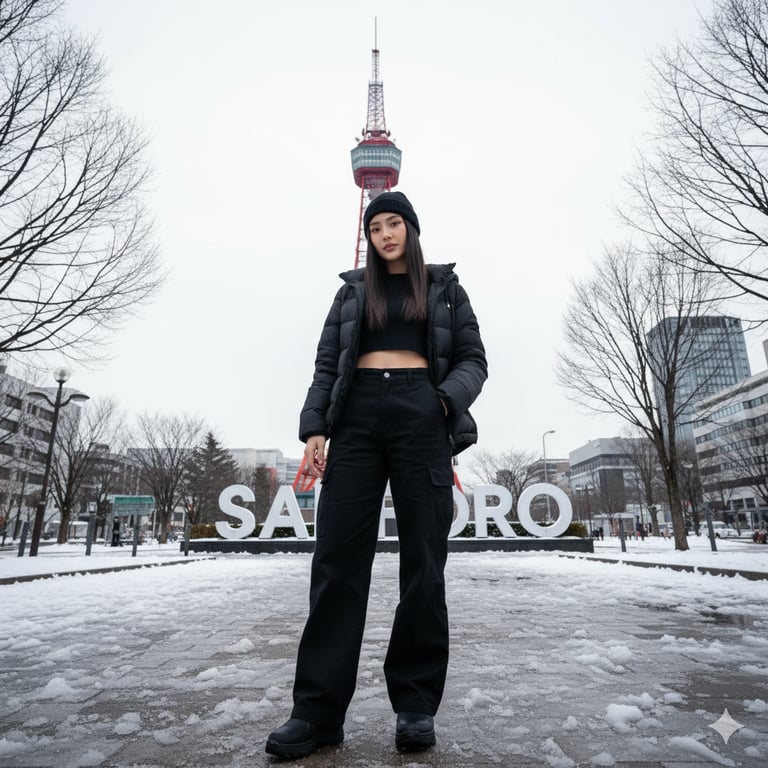 (ultra-realistic, high-detail photography, masterpiece, best quality, sharp focus) A full-body, low-angle fashion street style photograph of a confident young woman, standing centered in a snowy Odori Park, Sapporo, Japan. Her face and identity should be an exact match to the person in the reference image, including her facial features, skin tone, and distinct characteristics. The age of the person in the generated image should appear similar to the reference image. She looks directly into the camera with a calm, neutral yet self-assured expression, her head slightly tilted. Subject Details: The woman has long, straight black hair tucked into a black beanie. She is wearing a chic winter streetwear outfit consisting of a black long-sleeve crop top, layered with an open, black hooded puffer jacket, and paired with black high-waisted, wide-leg cargo pants. Her hands are casually posed, one in her pocket and the other resting on her thigh. She wears dark, practical winter boots. Background and Setting: The iconic Sapporo TV Tower stands majestically in the direct background, perfectly aligned with the subject. In front of the tower, a large architectural sign with the letters "SAPPORO" is visible behind her. The ground is covered in patchy, slushy snow, indicating the cold winter season. On either side of the frame, bare, leafless trees create a natural frame in the upper corners. Modern city buildings are visible in the distance on the right. Lighting and Atmosphere: The scene is illuminated by soft, diffused natural daylight, characteristic of an overcast sky. This lighting creates gentle, subtle shadows and prevents harsh highlights, resulting in a cool, serene, and atmospheric mood. The color palette is predominantly cool, dominated by the whites of the snow and sky, and the black of her outfit. The vibrant red of the Sapporo TV Tower provides a brilliant, contrasting pop of color that draws the eye. Composition and Technical Details: The composition is strong and symmetrical, with the subject and tower centered. The low-angle perspective enhances the sense of height and presence of both the woman and the tower. The shot is captured with a wide-angle lens, creating an expansive view of the urban winter landscape. The aperture is set to achieve a deep depth of field, keeping the woman and the immediate background sharp and in focus, while the distant cityscape is slightly softer. The image quality is superb, with incredible detail in the texture of her clothing, the snow on the ground, and the structure of the tower. The photograph is expertly retouched to balance exposure and enhance color vibrancy, looking like it was shot on a high-end DSLR camera.