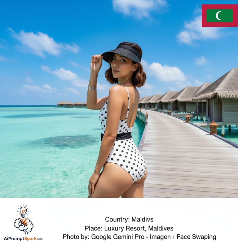 Generate photo of Ultra-realistic, professional high-fashion travel photograph, capturing a moment of serene luxury. Subject Identity & Face: The subject is a woman whose face, age, and identity are an exact match to the person in the provided reference image. Her facial expression, emotion, and head position must be maintained from the original pose: a subtle, captivating smile while looking back over her left shoulder directly into the lens. The AI must flawlessly integrate the facial features from the reference image onto the model, ensuring a natural and seamless composite. Subject Pose & Body: A stunningly beautiful woman is kneeling gracefully on the weathered wooden railing of an overwater boardwalk, her body angled away from the camera, but twisting her torso and head to look back over her left shoulder. Her pose is elegant and alluring, accentuating the graceful curves of her spine and figure. She has a chic, shoulder-length brunette bob haircut, styled in natural, slightly tousled waves with sun-kissed highlights that catch the light. One hand gently rests on the brim of her hat, a classic and sophisticated gesture. Attire & Accessories: She is wearing a meticulously designed one-piece swimsuit, featuring a timeless white fabric adorned with bold black polka dots. The swimsuit's silhouette is modern and flattering, with a high-cut leg design, thin spaghetti straps, and a distinctive, thick black horizontal band that cinches her waist, creating a belt-like effect that enhances her hourglass figure. She is accessorized with a wide-brimmed, solid black sun visor that casts a gentle shadow over her forehead, adding a touch of mystery and high-fashion sensibility. On her right wrist, a stack of delicate, shimmering silver bracelets adds a subtle touch of elegance. Setting & Environment: The scene is a breathtaking luxury resort in the Maldives. The wooden boardwalk, made of light-brown, sun-bleached planks, forms a strong leading line, guiding the viewer's eye through the composition. Lined up along the boardwalk is a row of identical, picturesque overwater bungalows, each with a classic thatched roof and wooden structure, receding into the distance. The water beneath and around the pier is a spectacular, crystal-clear turquoise and vibrant cyan, so transparent that the sandy ocean floor is visible in shallower areas. The sky above is a vast expanse of brilliant cerulean blue, punctuated by fluffy, perfectly white cumulus clouds, creating a dramatic and beautiful backdrop. Lighting & Atmosphere: The entire scene is illuminated by the intense, direct sunlight of a tropical midday. The lighting is hard and crisp, creating sharp, well-defined shadows that add depth and dimension to the subject and the environment. The sun, positioned high and slightly to the left, sculpts the woman's form, highlighting the musculature of her back and the texture of her skin. The bright reflection from the turquoise water provides a natural, soft fill light from below, subtly illuminating the shadows. The mood is aspirational, serene, and filled with the warmth of a luxurious tropical getaway. Photography Details: Camera & Lens: Shot with a high-resolution full-frame DSLR camera, paired with a sharp 50mm f/1.4 prime lens. Aperture & Focus: Aperture set to f/5.6 to ensure the subject is perfectly sharp while maintaining a clear, detailed background that conveys the sense of place. The focus is critically sharp on the woman's eyes and face. Composition: Masterful use of the rule of thirds, placing the subject on the left vertical line. The strong diagonal lines of the boardwalk create dynamic energy and depth. The camera angle is at eye-level with the subject. Style: A blend of high-fashion editorial, travel influencer photography, and professional portraiture. The image is polished, clean, and has a very high production value. Color & Post-Processing: The color palette is vibrant and saturated, dominated by the blues of the water and sky, the warm browns of the wood, and the high-contrast black and white of the swimsuit. The image has been professionally retouched: colors are expertly graded to enhance the tropical feel, and the overall contrast and clarity are boosted for maximum visual impact. The final result is hyper-realistic, incredibly detailed, and visually stunning, evoking a powerful sense of wanderlust and beauty. 8K, UHD, photorealistic