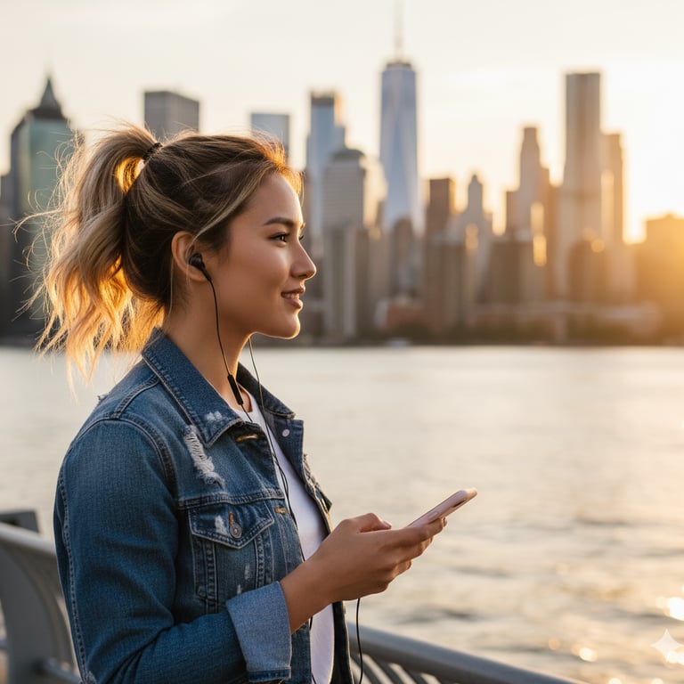 "A cinematic and evocative full-body photograph of a confident and beautiful young woman, exuding a sense of serene happiness and adventure. Her face, captured in a graceful profile view, is turned towards the gentle setting sun, a soft, contented smile playing on her lips. Her blonde hair is styled in a high, messy ponytail, with some wisps of hair framing her profile against the warm light. She is seen from the side, standing casually as if lost in thought, with her right hand gently holding a pastel pink smartphone. She wears a classic, slightly distressed blue denim jacket over a simple white t-shirt, creating a timeless and effortlessly cool look. A pair of sleek, black wired earbuds are discreetly visible in her ears. (use a face swap of a young woman from a second image, with a high degree of fidelity, to replace the existing face in this portrait, ensuring the facial expression and emotional tone are maintained in the new face. The new face should seamlessly integrate into the scene, matching the lighting and style.) The scene is set on a waterfront promenade, with a breathtaking panoramic view of a bustling metropolis, specifically the iconic skyline of New York City with its distinct skyscrapers, buildings, and structures in the background. The late afternoon sunlight, specifically during the golden hour, streams in from behind her, creating a powerful and dreamy backlight effect that beautifully outlines her silhouette and adds a stunning halo effect to her hair. The light is warm and soft, casting long, gentle shadows and bathing the entire scene in a rich, amber hue. The composition is a thoughtful medium shot, capturing her from the shoulders up, with the rule of thirds expertly applied to place her on the left side of the frame, giving ample space to showcase the magnificent cityscape. The depth of field is shallow, with the background cityscape rendered in a beautiful and artistic soft blur (bokeh) that brings all the focus to the woman. The overall tone is one of peaceful exploration and urban beauty. The image has a high-quality, professional feel, similar to a high-end travel or fashion portrait, with a touch of cinematic grandeur. The colors are predominantly warm and golden, with a strong emphasis on the interplay of light and shadow, creating a dynamic and emotionally resonant scene. The image is a candid moment, meticulously captured, with a natural grain and a realistic, unretouched feel that enhances its authenticity. The quality is a high-resolution, full-frame shot, rendered with a professional lens and lighting setup that highlights every detail from her hair to the texture of her jacket."