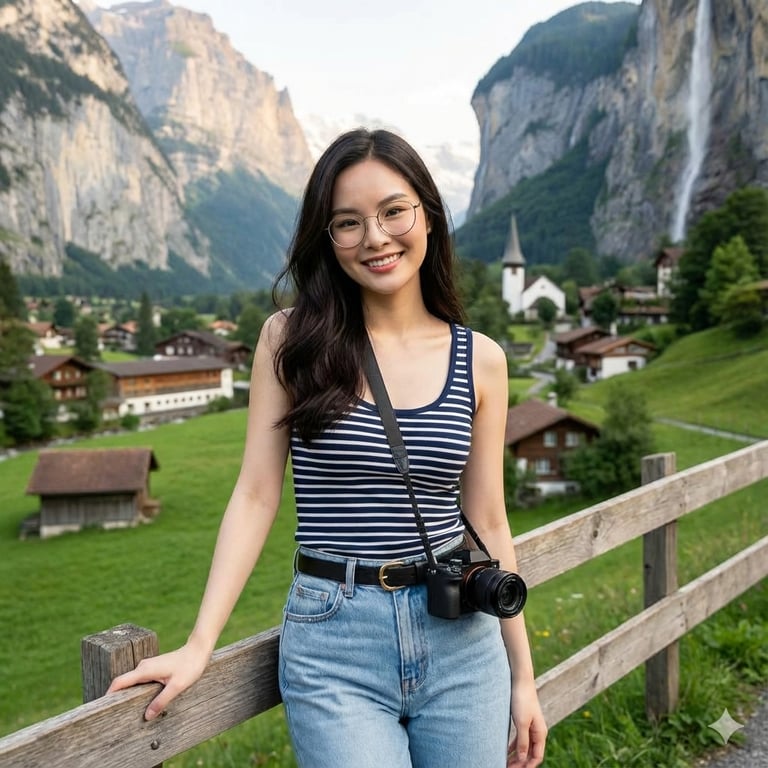 Hyper-realistic lifestyle travel portrait of a female subject standing on a scenic path in Lauterbrunnen, Switzerland. The subject is captured in a medium shot, leaning casually against a rustic wooden fence railing with her right hand resting on the wood, body angled slightly to the side but facing forward. She is wearing a navy blue and white horizontal striped scoop-neck tank top tucked into high-waisted light-wash blue denim jeans, with a black leather belt and a gold buckle. A black mirrorless digital camera hangs across her torso. The subject has long dark hair. [Use the specific facial structure and identity from the attached reference image, ensuring the age matches a young adult, expression is a warm happy smile, looking at camera]. Note: The subject is wearing round wire-rimmed glasses. The lighting on the face is soft, even, natural afternoon light, ensuring clear visibility of features for accurate face mapping. No harsh shadows on the face. The background is the stunning Lauterbrunnen valley with towering cliffs, waterfalls, green meadows, Swiss chalets, and a white church spire. 8k resolution, highly detailed texture, photorealistic style, sharp focus on the face and upper body.