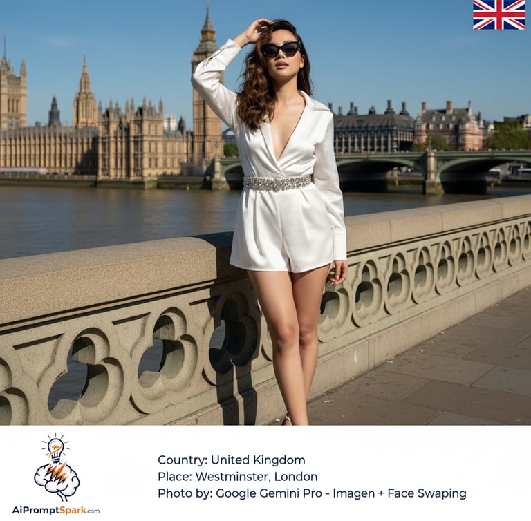 (A hyper-realistic, fashion-style, medium-full shot captures a confident woman, whose age, facial features, identity, skin tone, and physical characteristics are an exact match to the person in the provided reference image. She is posed elegantly on a bright, sunny day in London. The setting is iconic, with the subject standing on the stone pavement walkway of what appears to be Westminster Bridge, leaning slightly against the thick, beige stone parapet. She is positioned off-center to the right, adhering to the rule of thirds, creating a balanced composition with the famous landmark in the background. Her pose exudes high-fashion sensibility and confidence; she stands with her body angled slightly towards the camera's left, her left leg gracefully forward. Her left arm is raised, her hand delicately touching the side of her hair near her ear, with her elbow bent in a relaxed manner. Her right arm hangs naturally at her side. Her head is tilted slightly to her right, and she gazes directly into the camera lens with a composed, slightly aloof, model-esque expression, her lips fractionally parted, conveying a sense of assured glamour. (This specific pose, head tilt, and facial expression must be maintained). The subject's hair, while matching the color and texture from the reference image, should be styled in the medium-long, loose, voluminous waves seen in the original scene, cascading over her shoulders and shimmering in the sunlight. Her face is partially obscured by a pair of chic, dark-lensed sunglasses. The sunglasses are medium-sized with a rounded or subtle cat-eye frame, adding an element of mystery and sophistication. Her attire is a striking white satin shirt dress, possibly a romper. The luxurious satin fabric is highly reflective, catching the bright sunlight with a lustrous sheen that emphasizes its texture and folds. The garment features a deep, plunging V-neckline, created by the collared shirt being unbuttoned low, revealing her collarbones and a delicate gold chain necklace. The sleeves are long and finished with cuffs, but they are casually pushed up slightly towards the elbows, creating an effortless drape in the fabric. The garment is dramatically cinched at her natural waist by a wide, opulent, statement belt. This belt is heavily embellished with sparkling silver crystals or rhinestones, arranged in an intricate, glittering pattern, providing a sharp, glamorous contrast to the smooth white satin. The bottom half of the garment is very short, resembling either the shorts of a romper or a high-cut mini-skirt, showcasing her legs. On her feet, she wears elegant, pointed-toe high-heeled pumps in a matching white or off-white color. The shoes are meticulously designed, featuring a slim ankle strap that buckles at the side and a distinctive, sparkling crystal or pearl embellishment clustered on the pointed toe, echoing the glamour of her belt. The lighting is harsh, direct, natural sunlight, characteristic of a clear midday. The sun is positioned high and to the camera's left (the subject's right), casting strong, defined, dark shadows. A prominent, sharp shadow of the woman's silhouette is cast directly onto the large, beige stone parapet wall immediately behind her. This hard lighting creates extremely high contrast across the image, dramatically highlighting the rough texture of the sun-baked stone and the glossy sheen of her outfit, while also putting her face and the front of her body partially in shadow, which is intrinsically balanced by the reflective quality of her clothing. The background is unmistakable and integral to the shot, defining the location as London. To the left, the iconic Elizabeth Tower (Big Ben) rises majestically against a clear, vibrant, azure blue sky, completely free of clouds. The intricate neo-Gothic architecture of the Houses of Parliament extends beside it, its sandstone facade glowing warmly in the sun. Flowing between the subject and the Parliament building is the River Thames, its surface reflecting the deep blue of the sky. To the right, the stone structure of Westminster Bridge extends into the distance, with its classic arches and lampposts visible, leading the viewer's eye. The composition is a medium-full shot, capturing the subject from the top of her head down to her shins, with her high-heeled feet slightly cropped at the bottom of the frame. The camera angle is at eye level, or possibly tilted up a fraction of a degree, giving the subject a strong, present, and slightly imposing stance. The chosen lens appears to be a standard prime or short telephoto (perhaps a 50mm or 85mm on a full-frame sensor), which captures the subject and the background with excellent clarity without significant wide-angle distortion. The aperture is likely set to a moderate f-stop (e.g., f/5.6 to f/8), ensuring the subject is in tack-sharp focus while rendering the background landmarks clearly recognizable, though slightly softer than the subject, providing a perfect sense of depth and place. The overall mood of the photograph is chic, sunny, sophisticated, and aspirational, masterfully blending high-fashion sensibilities with iconic travel imagery. The color palette is dominated by the warm, earthy beige and cream of the sunlit stone architecture, the bright, clean, reflective white of the subject's outfit, and the deep, clear blue of the sky and river. The image quality is pristine, exhibiting high resolution, sharpness, and clarity, typical of a professional digital SLR or mirrorless camera. The post-processing is realistic, with vibrant color saturation, strong, punchy contrast, and a warm overall color temperature to emphasize the beautiful, sunny day in London.)