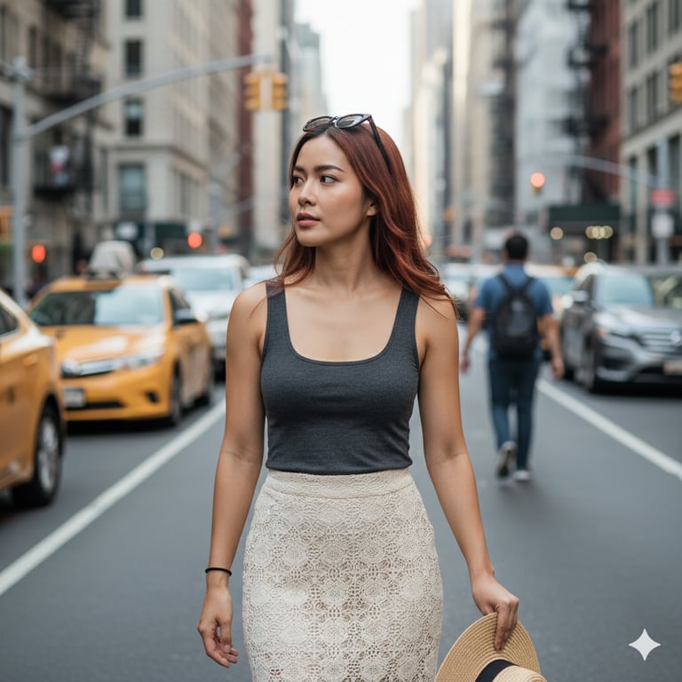 "Masterpiece, ultra-realistic, professional street style photograph capturing a candid moment in a bustling Manhattan street, New York City. The image embodies a cinematic and authentic lifestyle mood. The final image must use the face and identity from the provided reference image [InsightFace]. Subject Details: Woman: A young woman in her early 20s. [Crucially, her face, identity, and all facial features must be an exact match to the person in the reference photo, adapting her to the scene's lighting and expression]. She has a pensive and natural expression. Her head is turned in a three-quarter profile view, looking off-camera towards the left side of the frame as if she is observing the city life, perfectly matching the head angle and gaze direction of the original photo. Pose & Mood: She is captured mid-stride, walking with a confident and relaxed posture. Her body is angled towards the camera, but her head is turned away, creating a dynamic and engaging pose. The overall emotion is one of contemplative calm amidst urban chaos. She holds the wide brim of a straw hat in her left hand, down by her side. Her body type, pose, and hair style (long, reaching just past her shoulders, with a natural, slightly wavy texture and rich auburn/reddish-brown color) should be generated as described, with only the face being swapped. Attire & Styling: Top: She wears a form-fitting, dark charcoal gray or soft black cotton tank top with a classic scoop neckline. The fabric has a subtle texture, indicating it's a high-quality, comfortable material. Skirt: She is wearing a high-waisted, knee-length or midi skirt made of intricate cream-colored or off-white crochet lace. The detailed, delicate pattern of the skirt provides a beautiful textural contrast to the simple top, giving her outfit a bohemian chic vibe. Accessories: A pair of dark sunglasses rests casually on top of her head, pushed back into her hair. A single, thin black bracelet is visible on her left wrist. Photographic & Technical Specifications: Camera & Lens: Shot with a professional full-frame DSLR camera, using a high-quality prime lens like a Canon EF 85mm f/1.2L or a Sony G Master 50mm f/1.4. Aperture & Depth of Field: A wide aperture setting of approximately f/2.8 is used to create a shallow depth of field. The focus is razor-sharp on the woman's face, hair, and upper body, while the background dissolves into a soft, creamy bokeh. Lighting: The scene is illuminated by soft, diffused natural daylight, characteristic of an overcast day or open shade in a city canyon. The light source is positioned front and slightly to the side, sculpting her features with gentle highlights and soft shadows, avoiding any harshness. This lighting must be applied realistically to the swapped face. Composition: The composition follows the rule of thirds, with the woman placed on the right vertical line, walking into the open space on the left. The camera angle is at eye-level. The shot is a medium shot, framing her from the mid-thighs up. Shutter Speed: A fast shutter speed (e.g., 1/500s) is used to freeze her motion perfectly, ensuring every detail is crisp and clear. Background & Environment: Setting: An authentic, busy street in Manhattan, New York. In the blurred background, the iconic yellow NYC taxi cabs, other cars parked along the curb, traffic lights, and the facades of classic city buildings are visible. Another pedestrian can be seen in the distance. Atmosphere: The environment is dynamic and full of energy, but the focus on the subject creates a personal, quiet moment within the urban landscape. Color Grading & Post-Processing: Color Palette: The overall color palette is slightly desaturated with a cool, cinematic tone. The grays of the asphalt and buildings dominate, contrasted by the warm cream of her skirt and the vibrant red tones in her hair. Post-Processing: The final image is professionally color-graded to enhance the mood. Contrast is balanced to be natural yet impactful. The image retains a subtle film grain, adding to its authenticity and texture. The integration of the new face must be seamless and photorealistic."