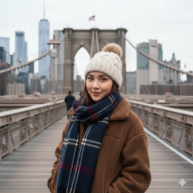 Generated masterpiece, best quality, ultra-detailed photorealistic travel lifestyle portrait, A radiant woman stands on the iconic wooden walkway of the Brooklyn Bridge. She is the central focus, framed as a medium shot from the waist up. The subject's face, features, and identity should be an exact match to the provided reference image. She maintains the original pose and expression: a pure, serene happiness; a genuine, gentle smile graces her lips, and her bright, clear eyes look directly and warmly into the camera lens, creating an intimate connection with the viewer. The age of the subject should accurately reflect the age of the person in the reference photograph. Her head is tilted ever so slightly to her left, a gesture of relaxed confidence. Subject's Appearance and Attire: Her long hair, of a color and texture matching the reference photo, peeks out from beneath a stylish, chunky cable-knit beanie in a creamy off-white color, topped with a large, fluffy pom-pom. She is bundled up for the cool city air in a fashionable and cozy oversized brown teddy bear sherpa fleece jacket, its texture visibly soft and inviting. Wrapped loosely around her neck is a large, thick plaid tartan scarf, featuring a classic pattern of deep navy blue, rich burgundy, and cream stripes, adding a touch of sophisticated color and texture to her winter outfit. Setting and Background: The setting is unmistakably the Brooklyn Bridge, New York City, on a cool, overcast day. The composition utilizes the strong leading lines of the bridge's metal railings and wooden planks to draw the eye through the image. In the background, the magnificent Lower Manhattan skyline unfolds, featuring the prominent silhouette of the One World Trade Center and other famous skyscrapers. The background has a beautiful, creamy bokeh, achieved through a shallow depth of field, which separates the subject from the bustling city behind her, making her pop. The iconic stone arches and steel suspension cables of the bridge are partially visible, framing the scene perfectly. A few other pedestrians can be seen in the distance, blurred and indistinct, adding a sense of scale and life to the scene without being distracting. Lighting and Atmosphere: The lighting is soft, diffused, and even, characteristic of a bright but overcast day. This natural light illuminates her face flawlessly, minimizing harsh shadows and highlighting her features. The overall mood is cheerful, wistful, and filled with the magic of travel and exploration. The atmosphere feels crisp, cool, and serene, capturing a perfect, peaceful moment amidst the energy of the big city. Cinematic and Technical Details: Captured with a professional DSLR camera, like a Nikon D850 with a 50mm f/1.4 prime lens. The aperture is set around f/2.8 to achieve the perfect balance between a sharp subject and a beautifully blurred background. The ISO is low to ensure a clean, noise-free image. The photograph is expertly color-graded with a modern, slightly desaturated film aesthetic, reminiscent of a VSCO filter. The color palette emphasizes the contrast between the warm, earthy tones of her brown jacket and the cool blues and grays of the sky and cityscape, creating a visually harmonious and compelling image. The final image is exceptionally sharp, with incredible detail in the texture of her clothing and the sparkle in her eyes. It is a perfect capture of a candid, joyful moment.