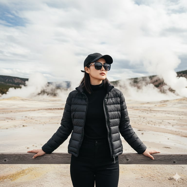 Attire: กำหนดเครื่องแต่งกายให้เป็น Chic Black (เสื้อแจ็กเก็ตพัฟเฟอร์/เสื้อกันหนาวสีดำ, กางเกงดำ, หมวกแก๊ปดำ, แว่นกันแดด Aviator) เพื่อสร้างความโดดเด่นตัดกับฉากหลังสีเหลือง/ครีมของแร่ธาตุในเยลโลว์สโตน