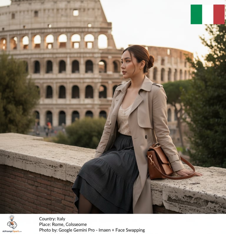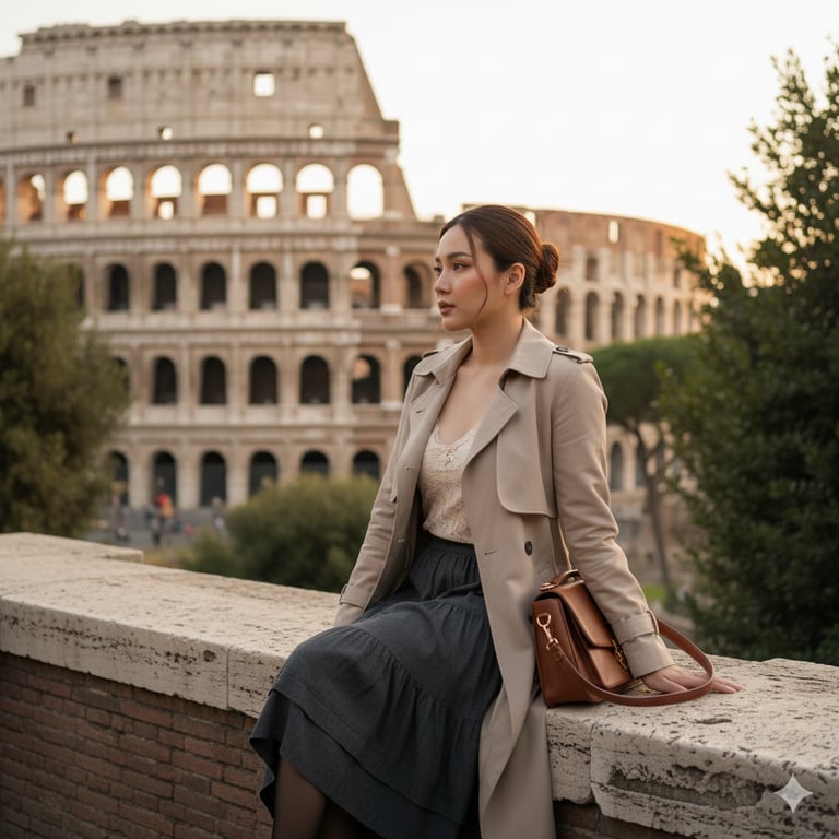 Masterpiece, high-resolution, photorealistic, an ultra-detailed photograph of a woman whose facial features, identity, and apparent age are a perfect and exact match to the provided reference image [insert your reference image here]. She is captured in a moment of serene contemplation in Rome during the magical golden hour. [SUBJECT & EXPRESSION] The subject is a graceful woman with a sophisticated and elegant aura, featuring the precise face and identity from the reference photo. While her identity is replicated, her expression and pose are specific to this scene: her head is turned in a three-quarter profile to her right, gazing thoughtfully into the distance, away from the camera. Her facial expression is calm, serene, and subtly confident, with a hint of a gentle, introspective smile. She has long, voluminous dark brunette hair with subtle sun-kissed auburn highlights that catch the warm light beautifully, styled in soft, natural waves that cascade over her shoulders. She is seated elegantly on an ancient, weathered stone wall, her posture relaxed yet poised. Her body is angled slightly towards the viewer, creating a dynamic and engaging composition. [ATTIRE & STYLING] Her outfit is a masterclass in chic European travel style. She wears a sophisticated, light taupe or beige trench coat, draped loosely and fashionably over her shoulders, not worn formally. Beneath the coat, she is wearing a delicate, V-neck camisole top in a pale cream or soft pink hue, featuring intricate lace or jacquard patterns that add a touch of romance and luxury. Her skirt is a voluminous, tiered midi skirt in a deep charcoal grey or muted olive green, made from a fabric with a subtle sheen that catches the light and adds texture. She is wearing sheer, elegant black tights that complement the skirt and add a layer of classic sophistication. Next to her on the stone wall rests a classic brown leather satchel bag with visible buckle details, completing her polished traveler look. [SETTING & BACKGROUND] The scene is set with the magnificent and iconic Colosseum in Rome as the breathtaking backdrop. The ancient amphitheater, with its grand arches and weathered golden-hued stones, is slightly out of focus, creating a beautiful bokeh effect that emphasizes the subject while maintaining a strong sense of place. The woman is surrounded by lush, vibrant green foliage and the branches of Mediterranean pine trees, which frame the shot naturally on the left. The sky above is a clear, soft blue, transitioning to warmer tones near the horizon. The overall environment feels peaceful, historic, and incredibly romantic. [LIGHTING & COLOR] The lighting is the hero of the image. It's a warm, diffused, golden hour light, characteristic of late afternoon sunlight in Italy. A strong, soft rim light from the side and back illuminates the subject's hair and silhouette, separating her distinctly from the background and giving her an ethereal glow. The shadows are soft and long, adding depth and dimension to the scene. The color palette is predominantly warm, dominated by the golden tones of the sunlight, the beige of the ancient stone, the rich greens of the trees, and the neutral colors of her attire, creating a harmonious and visually pleasing composition. [PHOTOGRAPHY & TECHNICAL DETAILS] This is a professional portrait and fashion photograph, shot on a high-end DSLR or mirrorless camera. The lens used is a prime lens, likely an 85mm f/1.4 or a 50mm f/1.2, to achieve the extremely shallow depth of field and beautiful background compression. The aperture is set wide open (e.g., f/1.8) to create the soft, creamy bokeh. The focus is tack-sharp on the woman's eyes and face. The composition follows the rule of thirds, with the subject placed on the right, looking into the negative space on the left. The camera angle is at eye-level or slightly low, making the subject appear graceful and important. The final image is professionally color-graded and retouched to enhance the natural beauty, balance the exposure, and create a cinematic, magazine-quality finish. The texture of the stone, the fabric of her clothes, and the strands of her hair are all rendered in hyper-realistic detail.